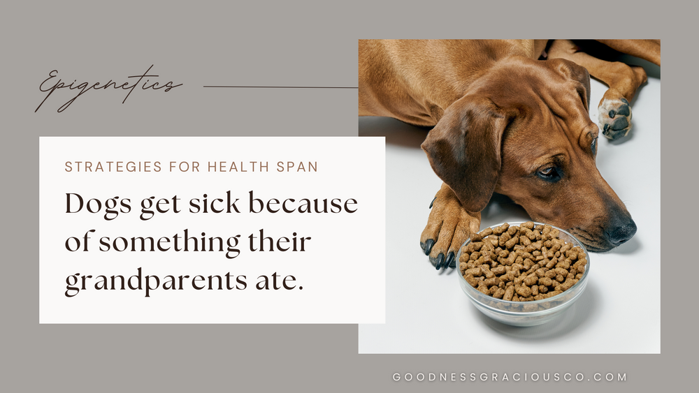 Kibble entered the pet food market in 1926, launching nearly a century of ultra-processed feeding. That’s 50 generations of dogs consuming foods far removed from what their bodies evolved to thrive on. Over time, this shift has set the stage for epigenetic transgenerational inheritance — the passing down of health risks such as poor muscle-to-fat ratio, metabolic dysfunction, and chronic disease through generations.