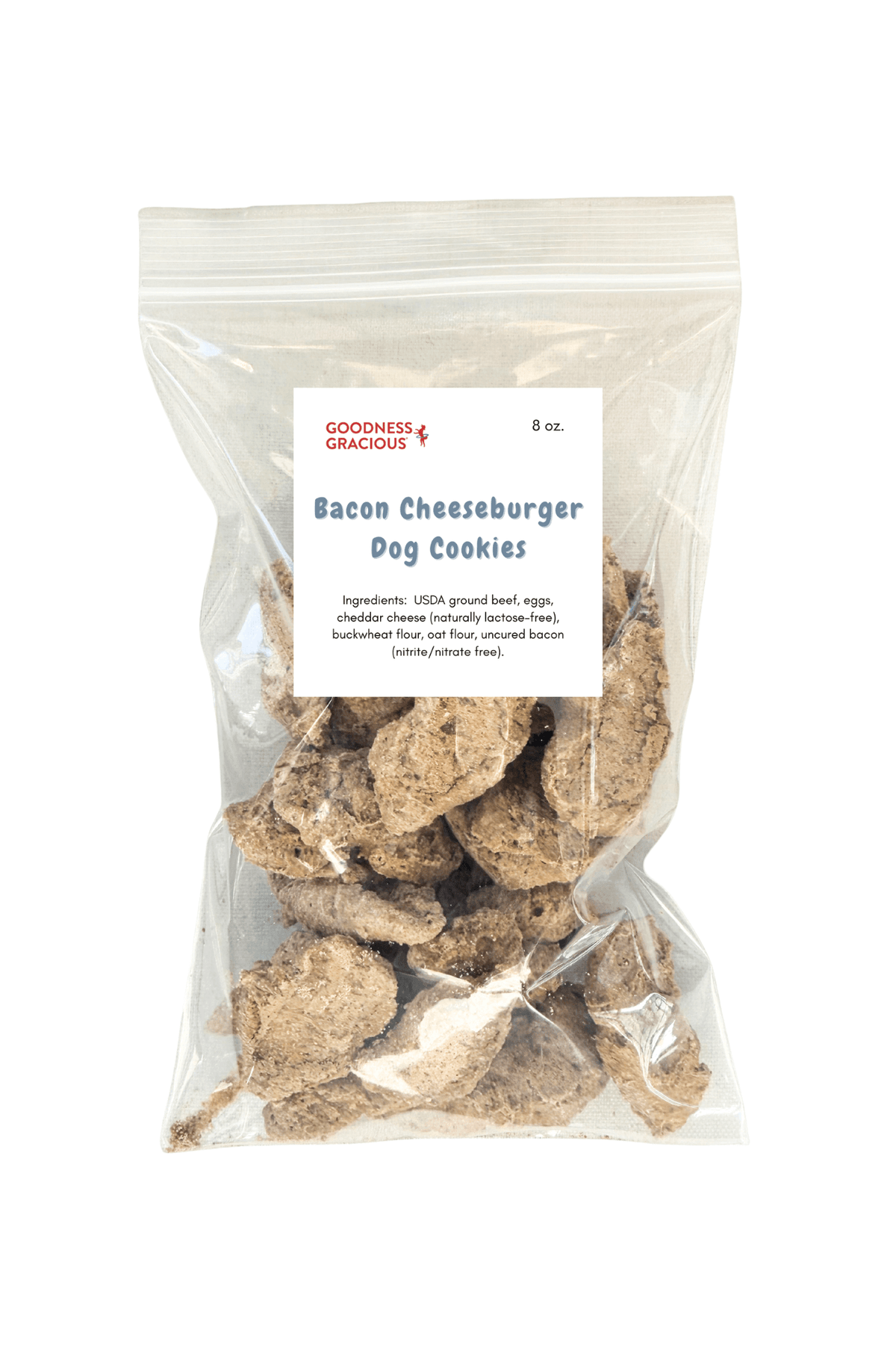 Let's face it. Everything tastes better with bacon. We use uncured (nitrate-free) bacon, and USDA approved beef that we grind ourselves. Top it with a little Vermont Cabot Mild Cheddar and you have a recipe for a delicious burger. you'll also get our Bacon Cheeseburger Dog Cookies!